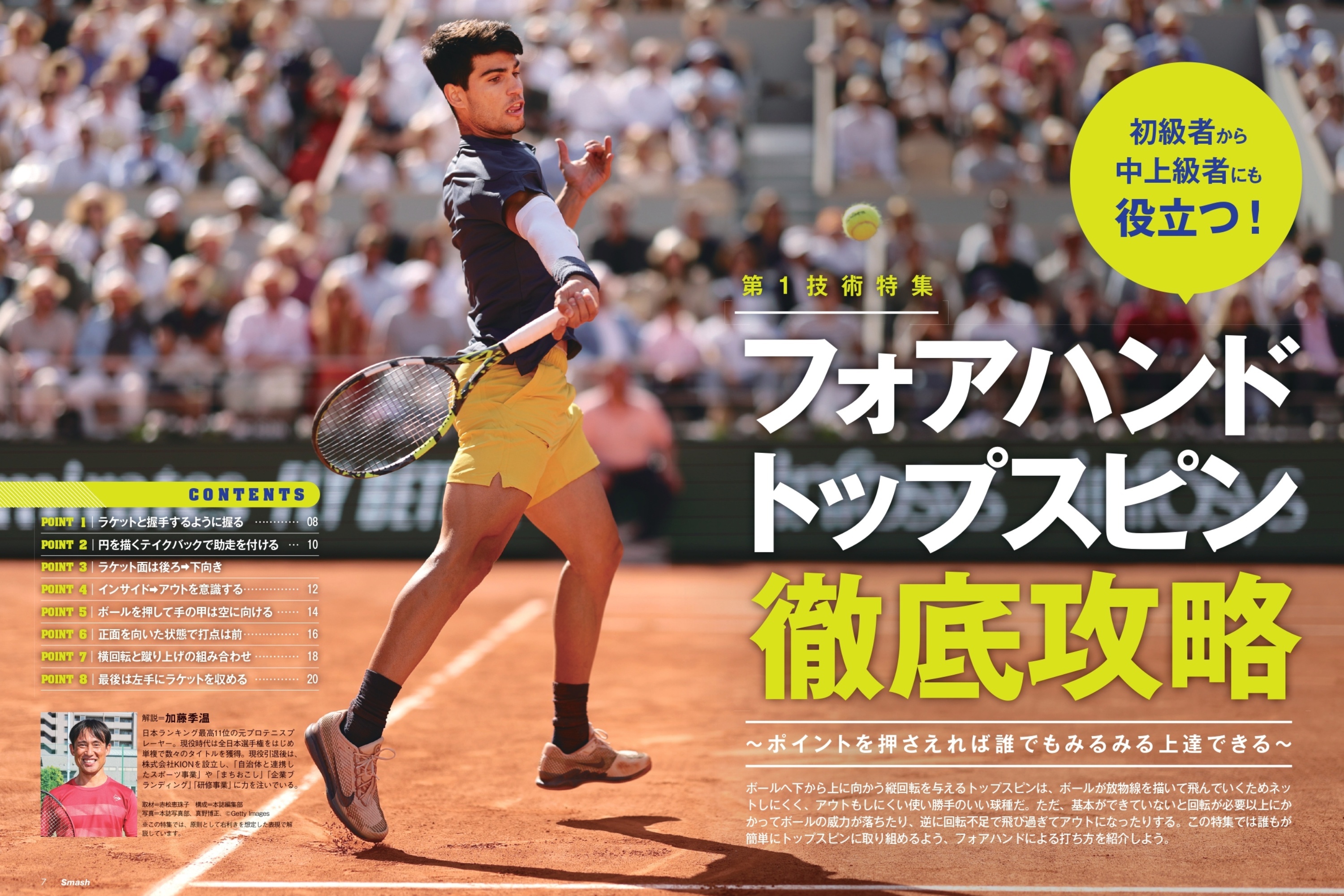 ボールへ下から上に向かう縦回転を与えるトップスピンは、ボールが放物線を描いて飛んでいくためネットしにくく、アウトもしにくい使い勝手のいい球種だ。ただ、基本ができていないと回転が必要以上にかかってボールの威力が落ちたり、逆に回転不足で飛び過ぎてアウトになったりする。この特集では誰もが簡単にトップスピンに取り組めるよう、フォアハンドによる打ち方を紹介しよう。